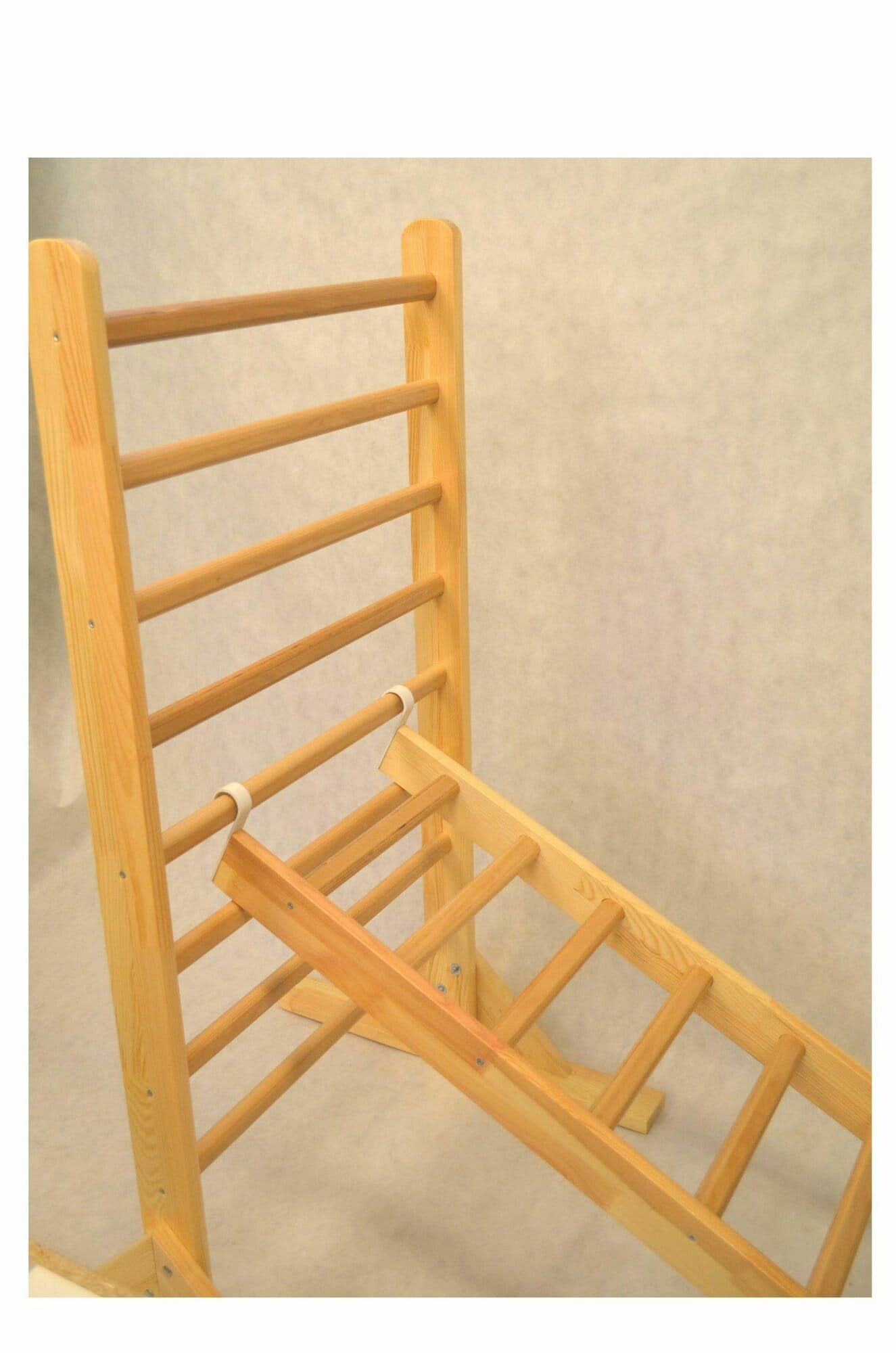 Funkcjonalna drabinka drewniana z zaczepem, służy do ćwiczeń poprawiających koordynację ruchową u dzieci. Boki drabinki wykonane są z drewna sosnowego lakierowanego 3-krotnie, a szczebelki ze sklejki 40x30 mm.