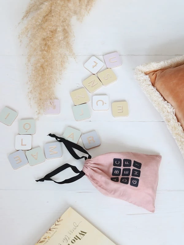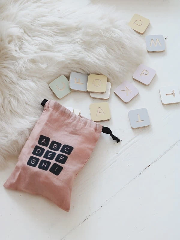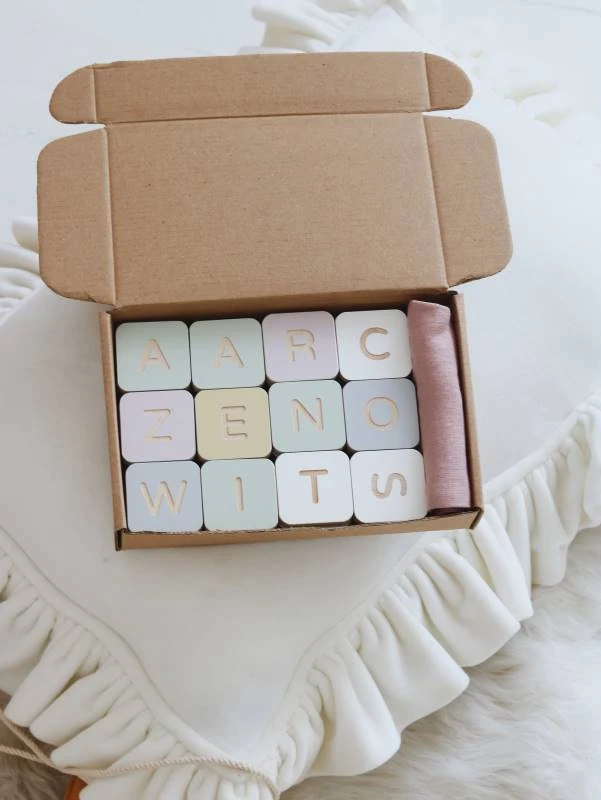 Zabawkawspierająca naukę liter. Zestaw 48 kolorowych klocków zwygrawerowanymi na awersie literami alfabetu łacińskiego, orazpolskimi znakami. Najczęściej występujące litery takie jak A, O,E są powtórzone, tak by można było swobodnie układać wyrazy. Dozestawu dołączony jest lniany woreczek w kolorze szarym, znadrukowaną grafiką.