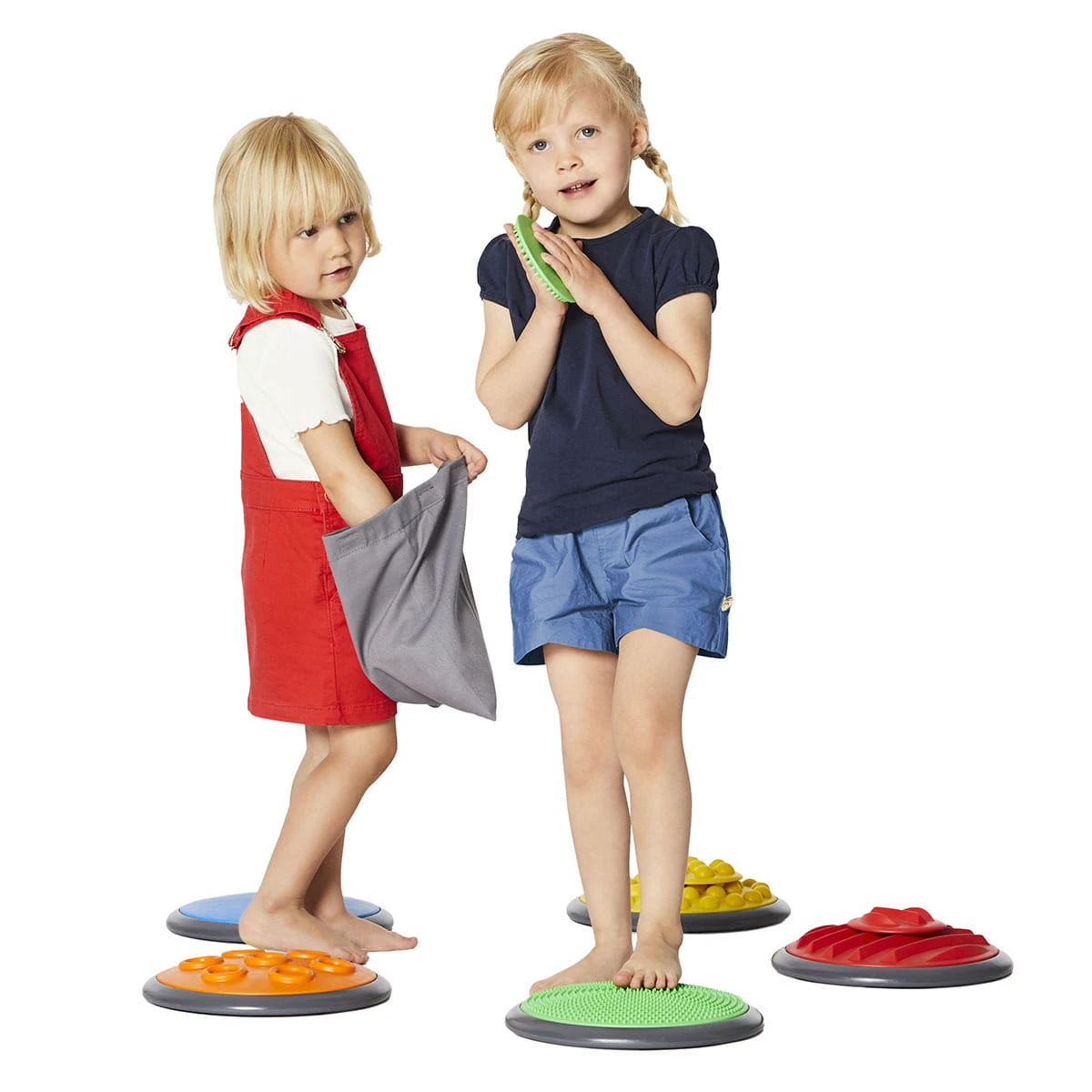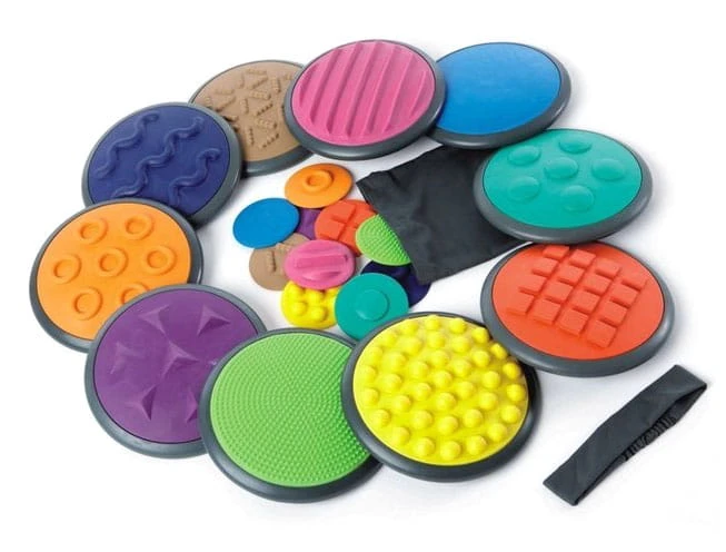 W zestawie dostępne są duże i małe dyski, można je wykorzystywać na różne sposoby, zwiększając lub zmniejszając poziom trudności zabawy, np. duży dysk dziecko dotyka stopami i rękoma odszukuje mały o tej samej strukturze.