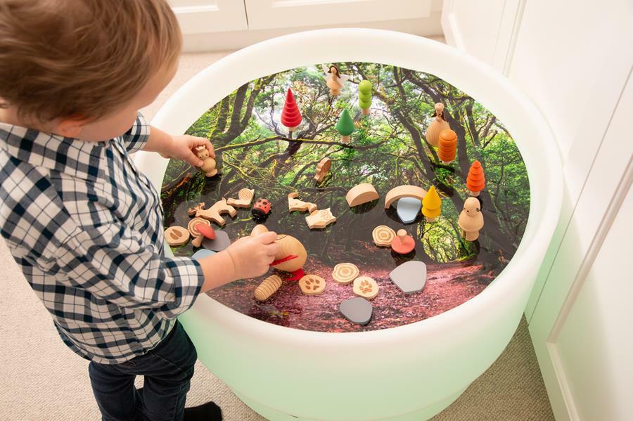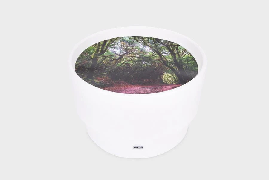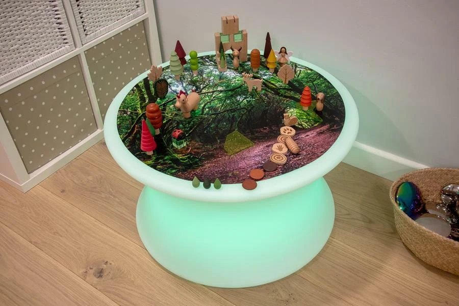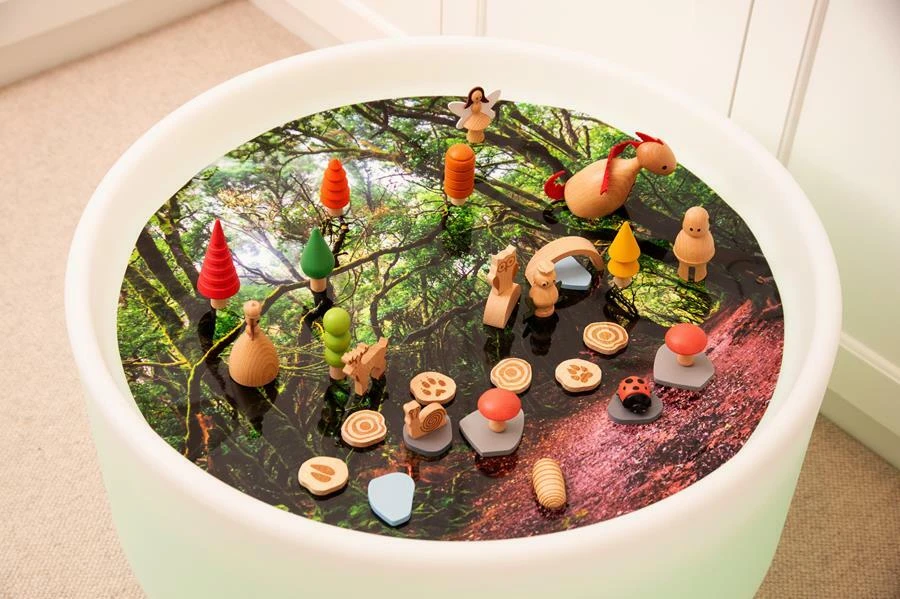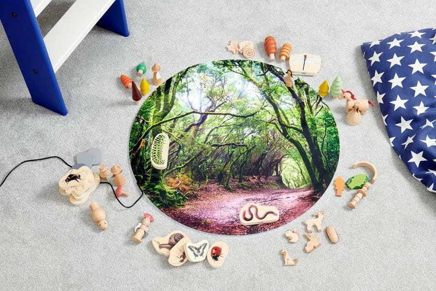 Mata z nadrukiem lasu jest idealnym dodatkiem do świecących stolików sensorycznych. Wydrukowana została z starannością, idealnie oddaje leśną ścieżkę i przenoszą dzieci do tajemniczego świata otoczonego drzewami. Mata stanowi doskonałą bazę do zabawy, można ją uzupełniać o figurki, liczby czy litery. Mata pasuje do stolików dostępnych na naszej stronie: podświetlanego stołu sensorycznego oraz okrągłego podświetlanego stołu sensorycznego z zagłębieniem na wodę i piasek. Mata wykonana jest z wytrzymałego poliestru, łatwa do czyszczenia. Idealnie wpasuje się w sale zabaw, przedszkola oraz pokoje dzieci. Dzięki swoim półprzezroczystym właściwościom mata szczególnie dobrze sprawdza się na panelu świetlnym lub nastrojowym stole, gdyż światło będzie przez nie prześwitywać, oświetlając porosty na drzewach i gałęziach. Wybrane źródło koloru będzie miało różny wpływ na wygląd maty: zmieniając niektóre kolory scenerii, intensyfikując kolory, a nawet sprawiając, że niektóre kolory będą sprawiać wrażenie fluorescencji- fascynujący sposób odkrywania kolorów podczas zabawy.
