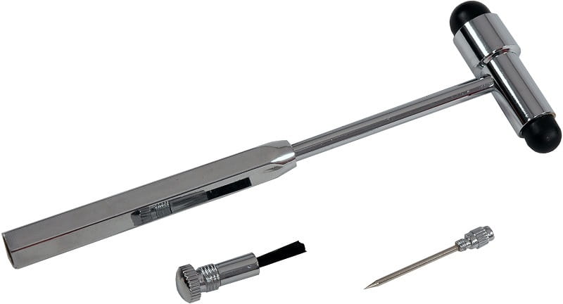 Młotek wyposażony w dwie główki, szczoteczkę oraz igłę, przeznaczony do badania czucia powierzchownego. Zastosowanie odpowiednich materiałów gwarantuje wyjątkową trwałość, dzięki czemu możliwe jest korzystanie z produktu przez długi czas.