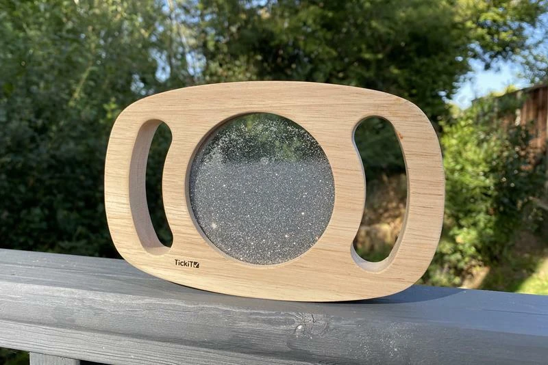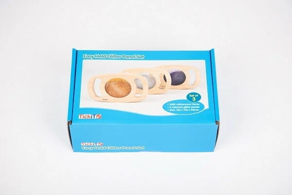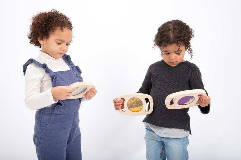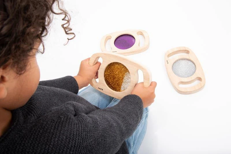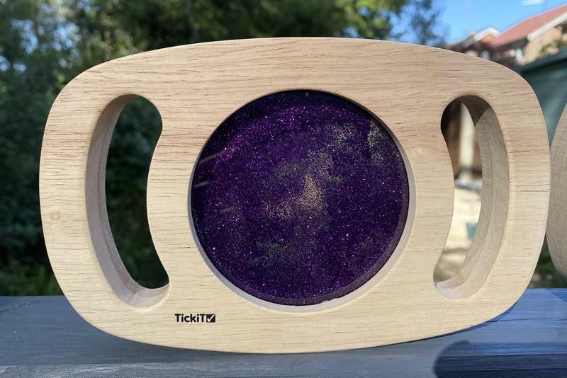 Zestaw 3 ramek z litego drewna kauczukowego z łatwymi do trzymania uchwytami, w których znajduje się panel z błyszczącym brokatem w środku - po jednym w każdym kolorze: fioletowym, srebrnym i złotym. Panele można skręcać i obracać, aby brokatowy płyn poruszał się i płynął w fascynujący sposób. Idealny do odkrywania zmysłów i poszerzania słownictwa opisowego.