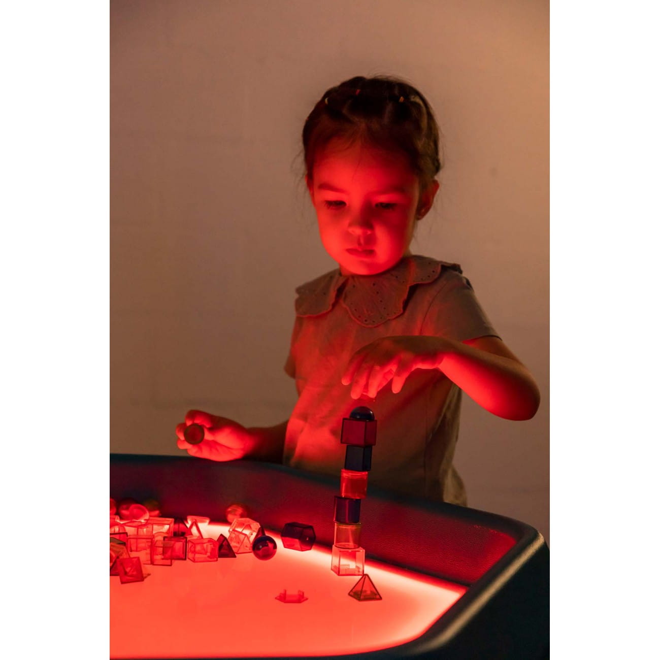 Ten zestaw zawiera różnorodne figury geometryczne – od sześcianów i prostopadłościanów po graniastosłup pięciokątny i stożek – wszystkie zaprojektowane z myślą o układaniu i tworzeniu pomysłowych konstrukcji. Półprzezroczyste elementy są nie tylko atrakcyjne wizualnie, ale także idealnie nadają się do użycia na stoliku świetlnym, umożliwiając dzieciom odkrywanie i eksperymentowanie ze światłem i cieniem podczas budowania i zabawy.