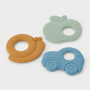 Zestaw sensorycznych gryzaków z rowkami i wypukłościami, które stymulują zmysł dotyku.
