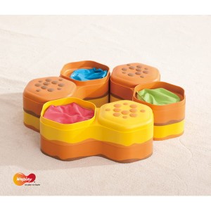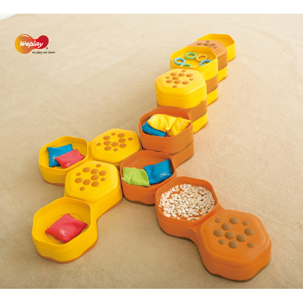 Wywodzący się z naturalnego kształtu plastra miodu tor Honey Hills wykorzystuje koncepcję pojemnika dotykowego i zamienia ścieżki w wymagające trasy o różnych poziomach wysokości. Dzięki zabawie w chodzenie dzieci mogą rozwijać swoje umiejętności motoryczne i stabilizację. Kontrastująca wypukłe i wklęsłe elementy, umożliwia łączenie i układanie w stosy, tworząc kreatywne ścieżki. Unikalna konstrukcja pojemnika pozwala użytkownikom na umieszczanie dowolnych, dotykowych materiałów. Przechodzenie między wypukłymi i wklęsłymi sześciokątami pozwala dzieciom doświadczać przesunięć środka ciała. Dotykowe torby ułatwiają wymianę zawartości i pozwalają na przechowywanie wszystkich dotykowych materiałów w środku. Specjalny wzór na powierzchni nie tylko zapewnia stymulację dotykową, ale także zapewnia stabilność antypoślizgową.