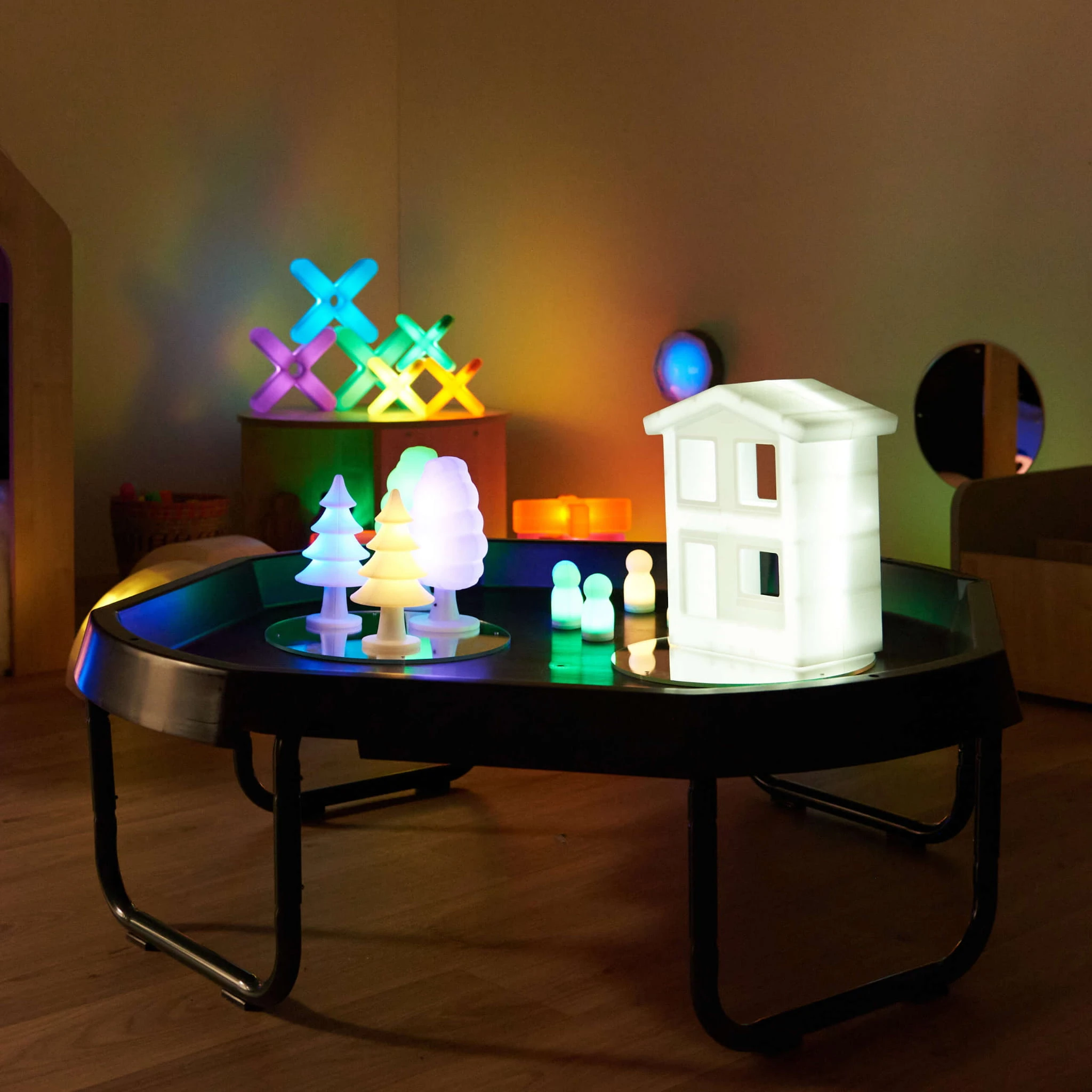 Zestaw dwóch świecących domków to idealny dodatek do kreatywnej zabawy dzieci. Realistyczne detale, takie jak cegły, liście, okna i drzwi, pobudzają wyobraźnię i zachęcają do odgrywania ról. Domki mogą pełnić rolę domu, sklepu, szpitala czy innego budynku, co rozwija umiejętności społeczne i narracyjne najmłodszych. Dzięki podświetleniu LED, domki dodają magicznego efektu i urozmaicają zabawę dziecka. Idealnie sprawdzają się do zabawy w ciemności np. jaskiniach/namiotach sensorycznych. Wykonane są z bezpiecznego i trwałego materiału.