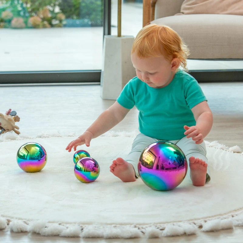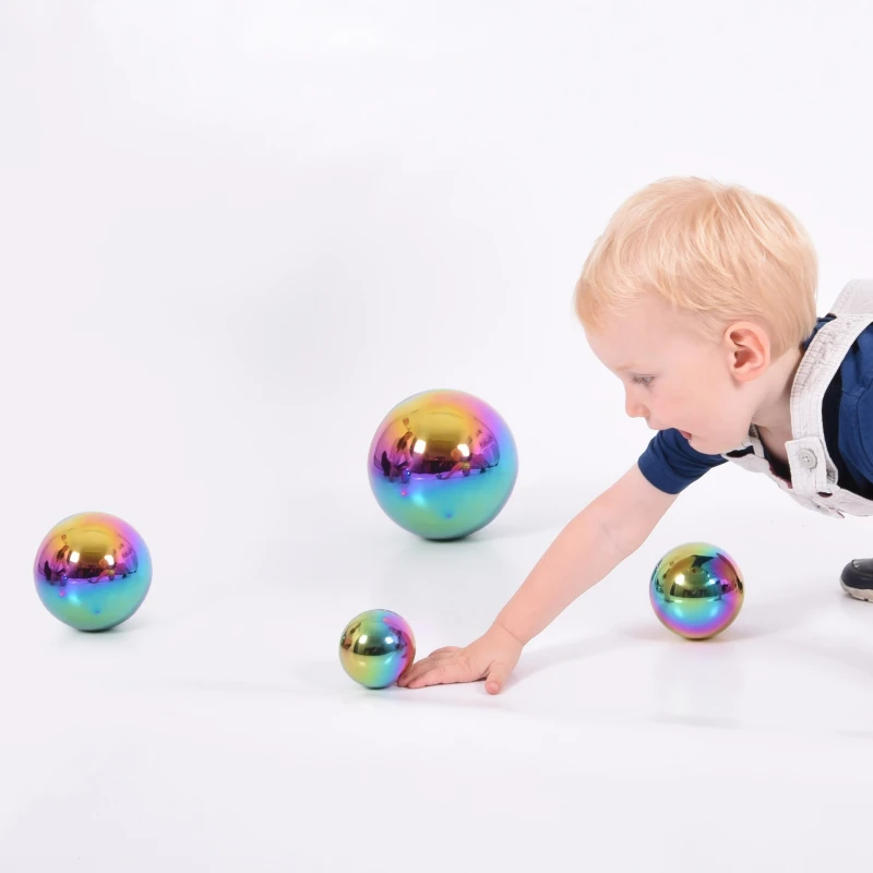 Piękne wielokolorowe kule są wykonane z wytrzymałej stali nierdzewnej. Efekt eksplozji kolorów zapewnia spektrum metalicznych odcieni na każdej kuli, natomiast odbicie przypomina efekt rybiego oka. Stal nierdzewna jest ciepła w dotyku, co zachęca do dalszych odkryć sensorycznych, a wytrzymały i lekki materiał sprawia, że piłki są łatwe w obsłudze i eksploracji nawet dla najmłodszych dzieci.