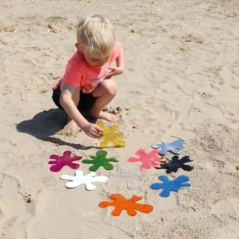 Zestaw zabawnych, rozpryskujących się kolorowych plam, wykonanych z przezroczystego, nieprzezroczystego i lustrzanego akrylu o grubości 3 mm. Zestaw zawiera plamy w kolorach podstawowych i pochodnych (czerwony, niebieski, żółty, zielony, pomarańczowy i fioletowy), a także przezroczyste, czarne, białe i dwustronne lustro. Można ich używać z powodzeniem, w zabawach z wykorzystaniem podświetlanych stolików sensorycznych oraz podświetlanych paneli. Idealnie sprawdzą się także w zabawach na zewnątrz, jako akcesoria do dekoracji ściennych oraz okiennych. Kształty posiadają otwór w średnicy 2,5 mm.