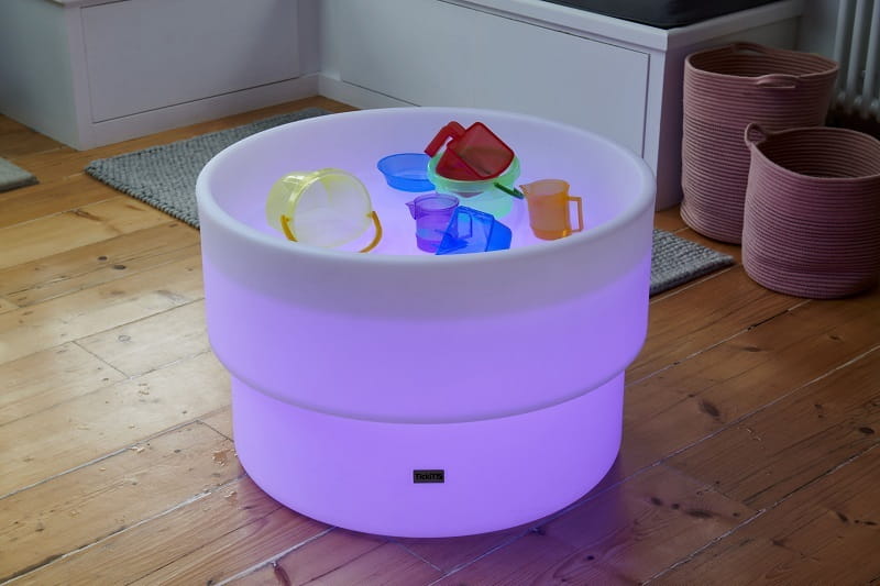 Zmieniający kolory stół na piasek i wodę zapewnia zupełnie nową perspektywę eksploracji i zmysłowego odkrywania. Stolik emituje miękkie światło, którego kolor można zmienić za pomocą pilota. Zagłębienie może być używane do wody, piasku, galaretki, piany lub półprzezroczystych obiektów. Produkt daje wiele różnych sposobów odkrywania świata za pomocą światła i koloru.