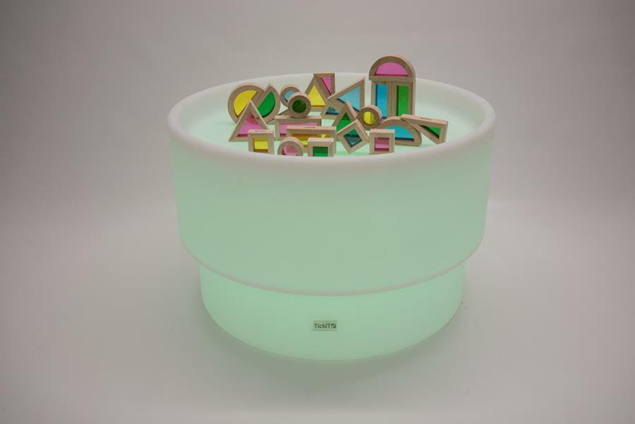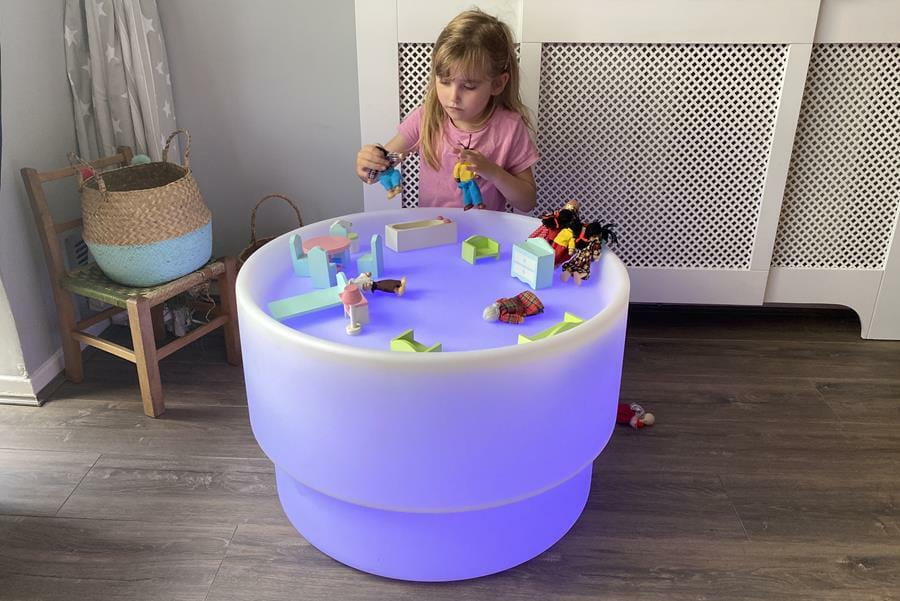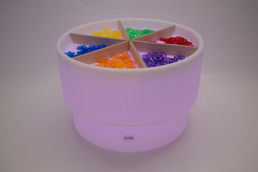Podświetlany stolik sensoryczny idealnie sprawdzi się w salach zabaw, przedszkolach oraz pokojach dziecięcych. Stolik zmieniają kolor światła, ma podniesioną zewnętrzną krawędź, co tworzy obszar do nauki poprzez zabawę i eksplorację. Solidna, ale lekka konstrukcja jest estetyczna oraz praktyczna: łatwa do przenoszenia między lokalizacjami, szybka w czyszczeniu i idealna do indywidualnej lub wspólnej zabawy. Zapewniają miękkie, kolorowe lub białe światło, które można regulować za pomocą pilota, obszar odkrywania może być używany do sortowania i układania obiektów, odkrywania różnych materiałów i substancji (płyn, piasek, galaretka, pianka). Wszystkie sensoryczne lampki nastrojowe mają klasę energetyczną A+ i stopień wodoodporności IP65. Zawierają uniwersalny zasilacz (kompatybilny z Wielką Brytanią/UE/USA/AU) z zasilaczem sieciowym niskiego napięcia. 8-godzinny cykl ładowania zapewni średnio 5-10 godzin światła (w zależności od ustawień programu). Podświetlany stolik sensoryczny nie zawiera pokazanych akcesoriów do zabawy.