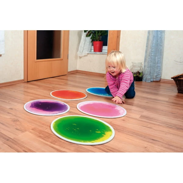 Zestaw kolorowych kafelek sensorycznych ze zmieniającą pod wpływem nacisku cieczą. Świetna zabawa dla małych dzieci, które mogą odkrywać jak zachowuje się ciesz pod wpływem ruchu. Ten fascynujący produkt umożliwiają tworzenie z każdym krokiem nowego, cudownie kolorowego i pomysłowego wzoru. Maty wykonane z nowoczesnego materiału – podobnie jak w przemyśle lotniczym – wypełnione są płynem kosmetycznym (nietoksyczny, nietrujący), o dużej gęstości, posiadają antypoślizgowy spód. Powłoka o grubości 3,5 mm jest szczególnie odporna na zarysowania i ścieranie, a każda mata ma wytrzymałość do 90 kg. Zabawa z płytkami żelowymi pomaga ćwiczyć koncentrację i równowagę.