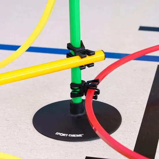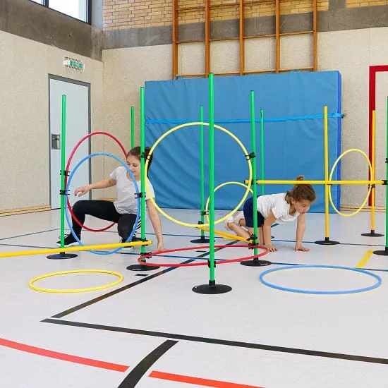 Torprzeszkód z systemem modułowym, który można dowolnie zmontować iłączyć z innymi zestawami. Dzięki szerokiemu zakresowizastosowania jest to idealny zestaw dla żłobków i przedszkoli,składający się z drążków gimnastycznych, obręczygimnastycznych i akcesoriów mocujących. Zestaw sprzyja kreatywnościdzięki szerokiej gamie możliwych kombinacji: już samo złożeniezestawu pomaga budować kreatywność. Zabawa na torze przeszkódpoprawia koordynację i percepcję oraz ćwiczy utrzymywanierównowagi. Tor nadaje się do użytku wewnątrz jak i nazewnątrz.
