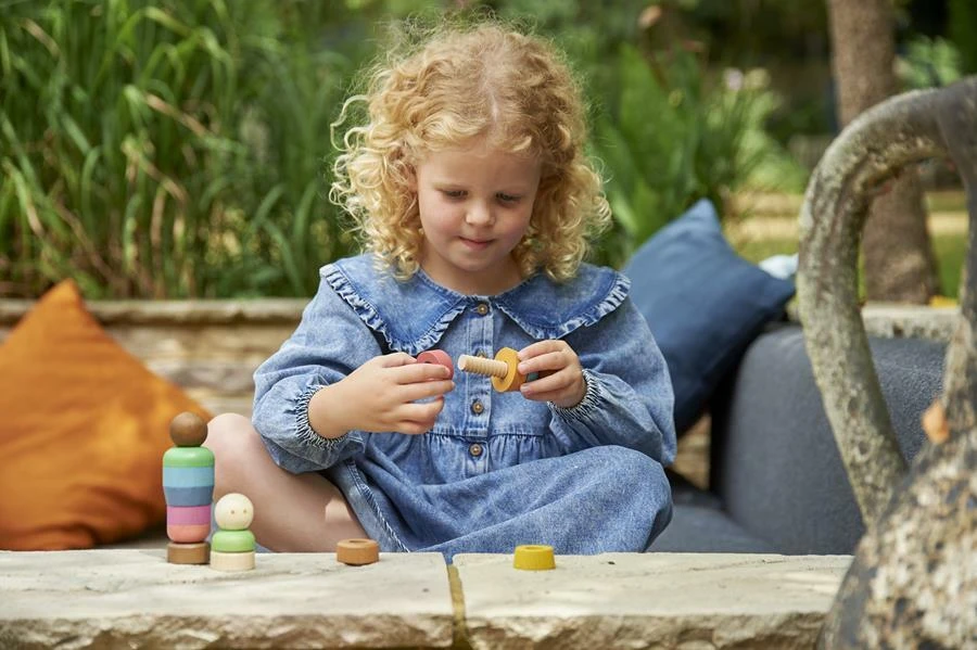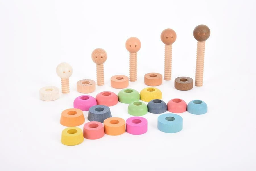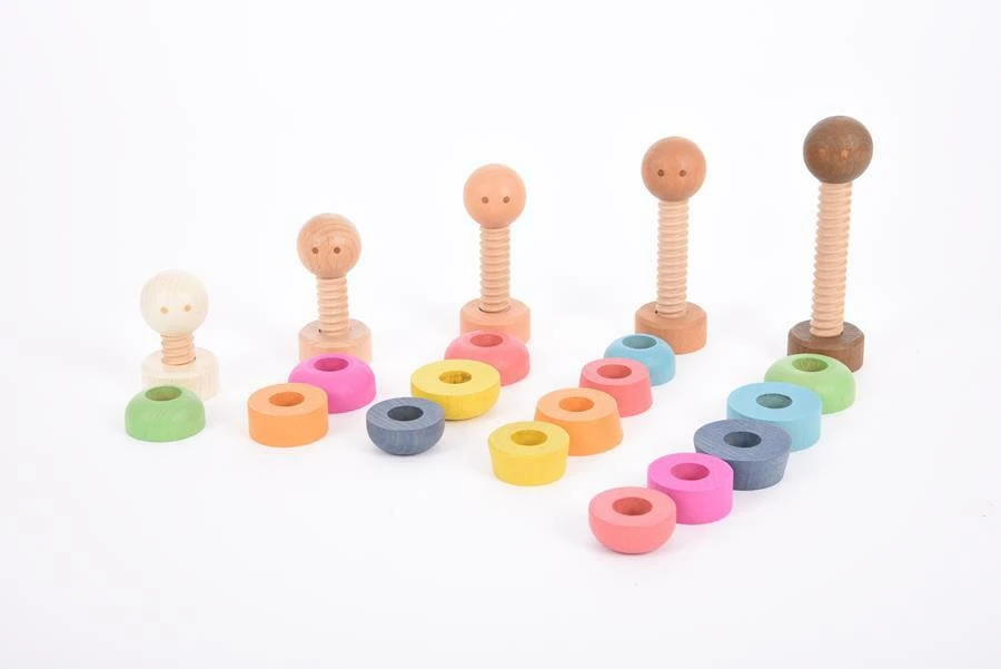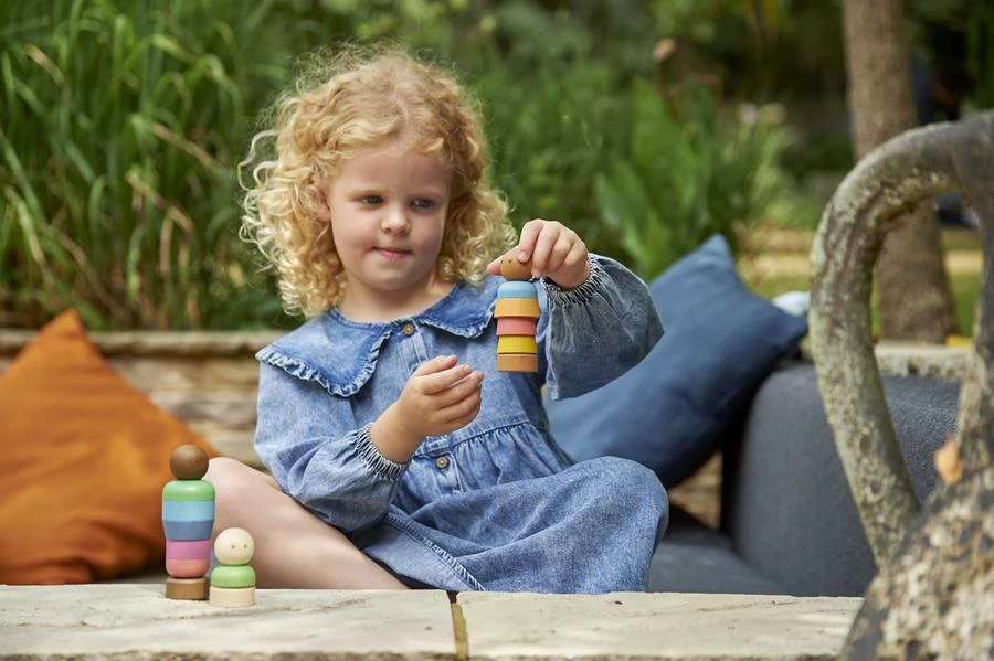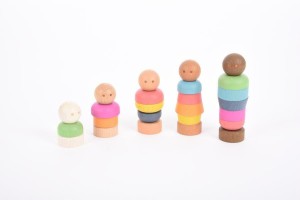 Zestaw figurek ludzi z gładkiego drewna bukowego o różnych odcieniach skóry. Figurki składają się z 5 głów w kolorze skóry na gwintowanych korpusach, dodatkowych 15 wsuwanych ubrań w tęczowym kolorze i 5 „nóżek” w kolorze skóry, które przykręca się, aby zabezpieczyć elementy na miejscu. Dzieci mogą łączyć i dopasowywać mankiety do głów i stóp, tworząc ciała o różnych kształtach i kolorach. Idealny do zabaw w świat, rozmów o rodzinie i społecznościach, poznawania podobieństw i różnic, rozwijania języka opisowego oraz doskonalenia umiejętności motorycznych i koordynacji ręka-oko. Zawiera bawełnianą torbę do przechowywania ze sznurkiem.