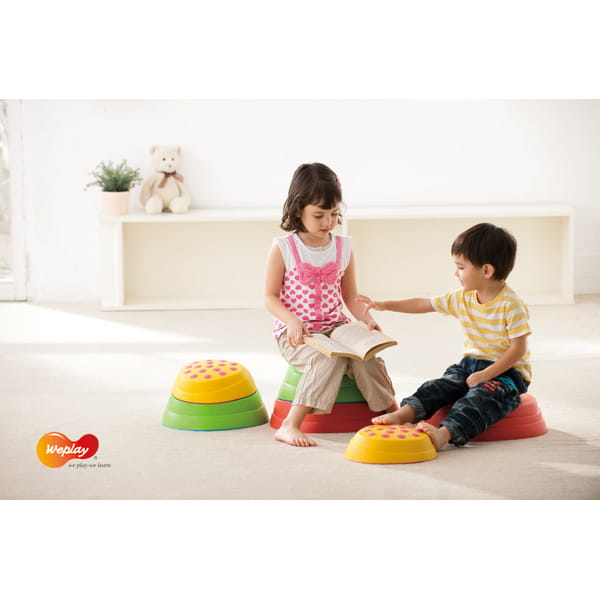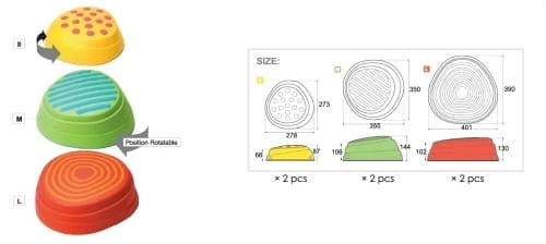 Produkt oferuje zabawne zajęcia z kolorowymi komponentami. Poprawia zdolności motoryczne i koordynację równowagi poprzez zabawę. Proste komponenty umożliwiają różne projekty tras w dowolnym stylu. Każdy rozmiar kamienia ma różne nachylenia. Układaj jeden na drugim, aby tworzyć różne wyzwania dla użytkowników o różnych potrzebach. Kropki, linie i koncentryczne okręgi na powierzchni kamienia pobudzają zmysł dotyku. Antypoślizgowa górna powierzchnia i dolna krawędź zapewniają najlepszą stabilność i bezpieczeństwo. Podczas użytkowania na boso, dzięki stymulacji aktywuje się percepcja dotykowa a podczas układania tras wzbogaca się umiejętność planowania. Produkt poprawia pewność siebie, zdolność reakcji i siłę uczenia się poprzez wyzwania, które oferuje.
