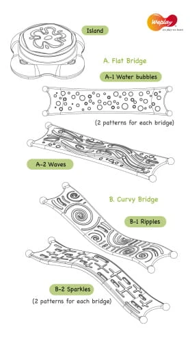 Doskonała zabawka wspomagająca rozwój zdolności motorycznych u dzieci. Ten produkt, inspirowany sadzawką lilii wodnych, składa się z zielonych wysp - liści do układania w stos i niebieskich mostków. Na mostach i wyspach znajdują się różne tekstury, takie jak płatki, bąbelki, fale czy iskierki. Wykonane z materiału antypoślizgowy, co jest dużym przełomem w zapewnieniu dobrego bezpieczeństwa w tego typu ścieżkach sensorycznych. Dzięki tym pięknym elementom dzieci mogą swobodnie tworzyć wiele niesamowitych ścieżek i działań sytuacyjnych. Zabawa z produktem poprawia koordynację fizyczną i zręczność oraz rozwija równowagę. Aranżacje różnych zabaw pomagają dzieciom rozwijać koncepcję przestrzenną oraz doskonalić umiejętności planowania działań i rozwiązywania problemów.