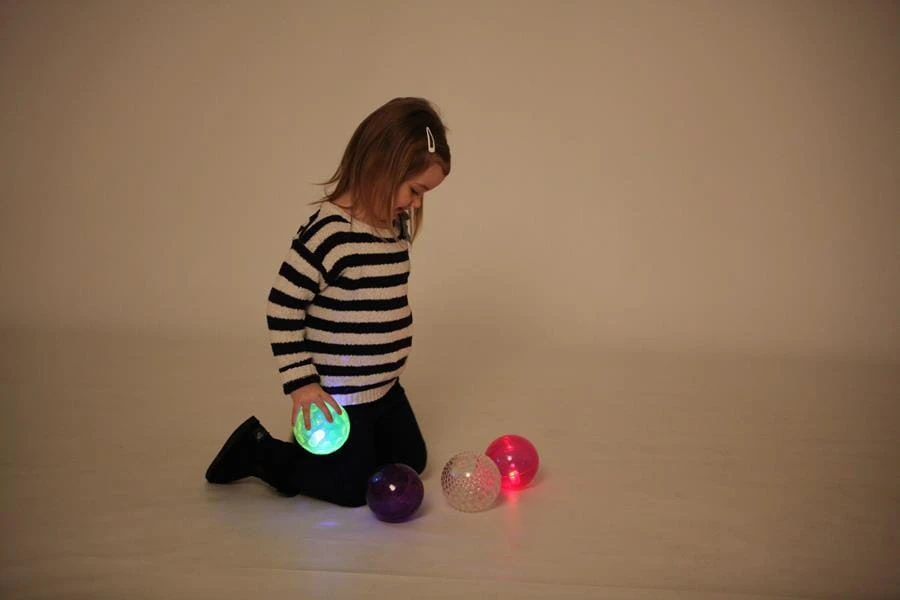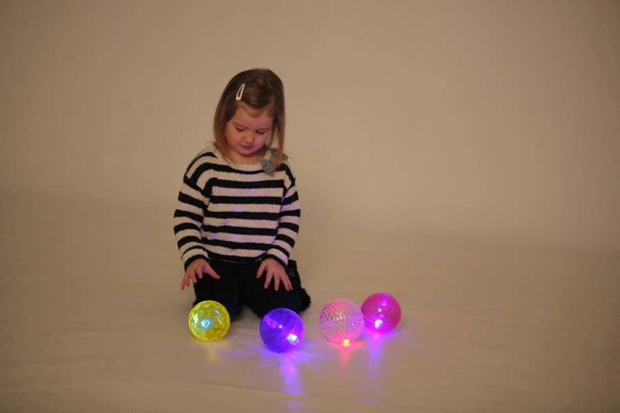 Kolorowe piłki, które świecą i migają po odbiciu, dzięki czemu dzieci uwielbiają się nimi bawić. Każda z nich posiada charakterystyczną powierzchnię, co pozwala wykorzystać je w różnego rodzaju zabawach i ćwiczeniach rozpoznawania kształtów. Dodatkowo, po uderzeniu o podłoże piłki odbijają się pod dziwnymi kątami, co sprawia, że łapanie ich jest dla dzieci nie lada wyzwaniem i świetną zabawą.Właściwości Świecących piłeczek